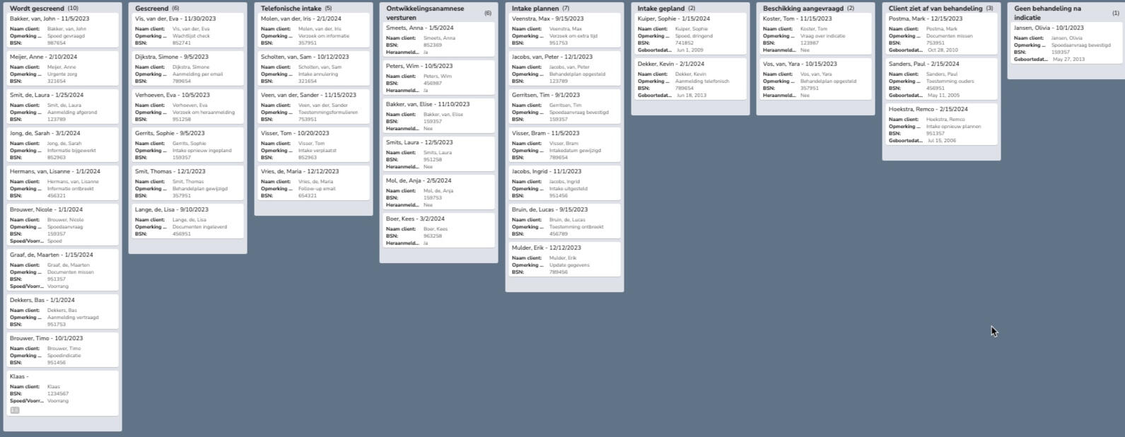 Continu volledig inzicht binnen elke stap van het proces, van aanmelding tot start behandeling, inclusief gegevensverzameling, telefonische intake, eerste indicatiestelling en behandeling.Flexibel, snel en gebruiksvriendelijk te onderhouden en in te richten door de interne organisatie. Zo sluit het proces altijd aan op uw specifieke wensen.Automatiseer de aanlevering van gegevens aan de Nederlandse Zorgautoriteit (NZA)Integreer aanmeldingen rechtstreeks (met 1 klik) via uw website met een geïntegreerd aanmeldformulier.Analyseer en rapporteer op essentiële data zoals wachttijd per indicatie of zorgverzekeraar.